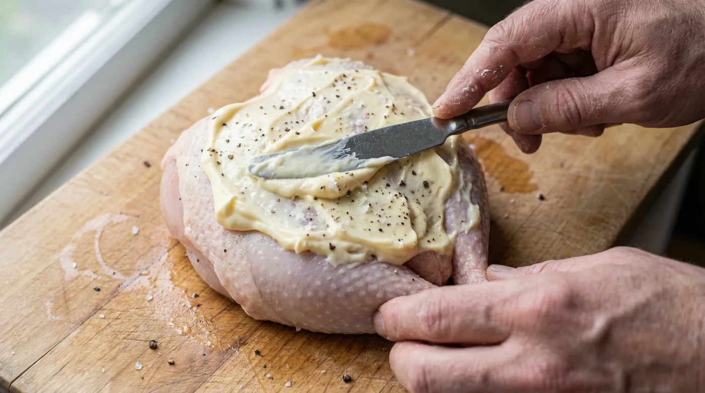 When you slather a chicken breast in mayonnaise, the emulsion of oil and egg yolks creates an unbeatable protective barrier. As the chicken roasts, this rich layer seals in the poultry’s natural juices, completely preventing the dreaded dry texture of standard oven-roasted chicken.