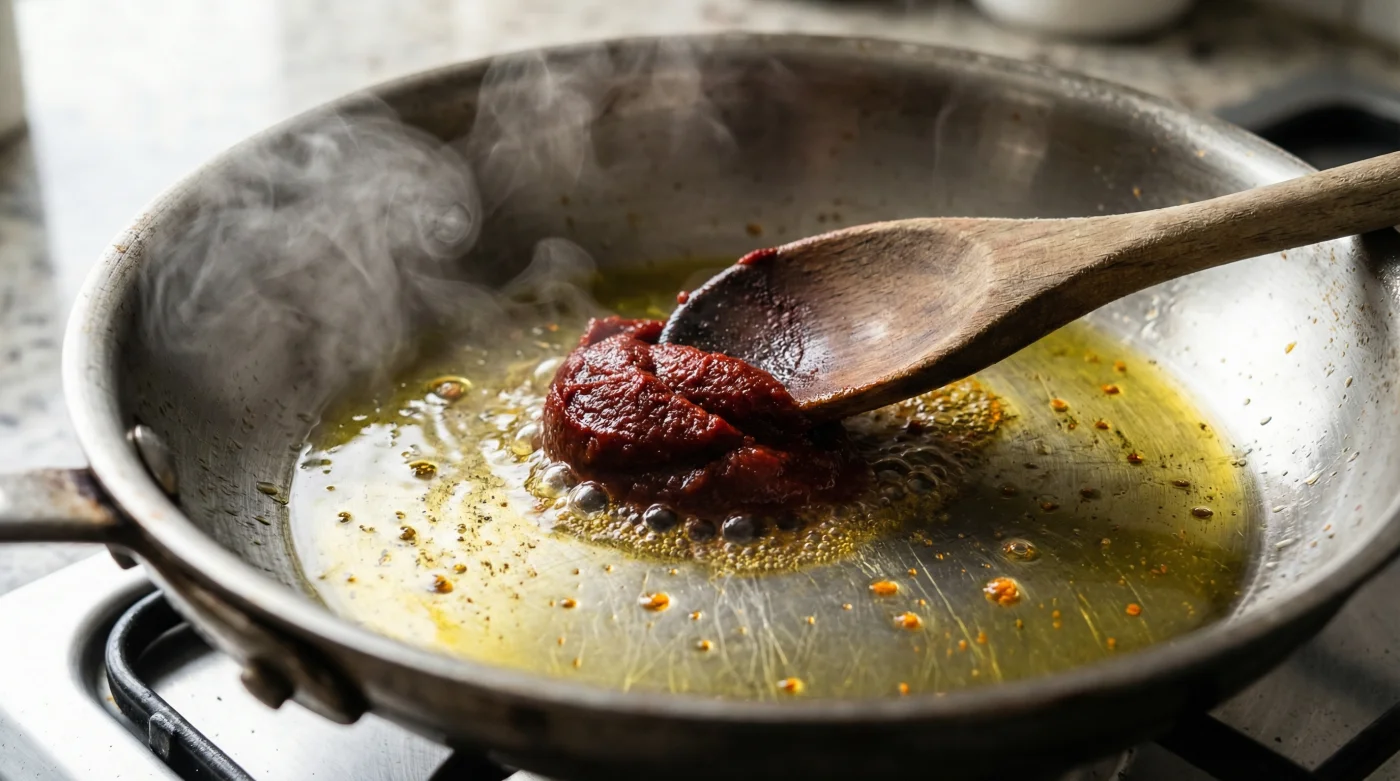 Frying the paste fundamentally changes its chemical structure. When tomato paste hits hot olive oil, the natural sugars trapped inside the concentrate begin to caramelize. The sharp, acidic edge burns off, replaced by a sweet, savory umami that coats the tongue. It changes the entire architecture of your dish.