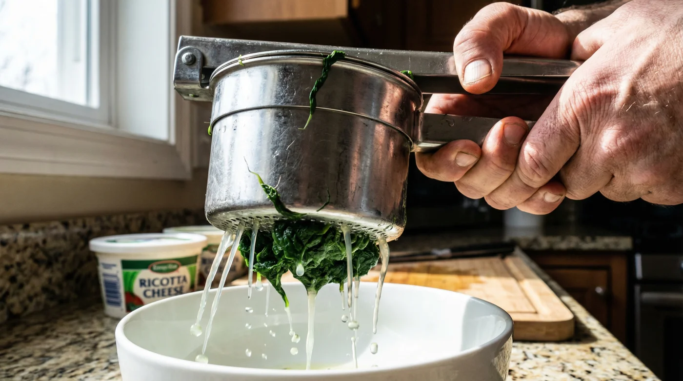 I learned this years ago while watching a prep chef named Marco in the cramped kitchen of a neighborhood Italian spot. He had to prep fifteen pounds of spinach for the evening’s manicotti rush. There were no cheesecloths in sight, and certainly no paper towels. He simply loaded handfuls of the wet greens into a heavy stainless steel potato ricer. “You press it,” he muttered, squeezing the long handles together. A solid stream of dark green water cascaded out, leaving behind a perfectly dry, dense puck of spinach. It was a revelation in leverage.