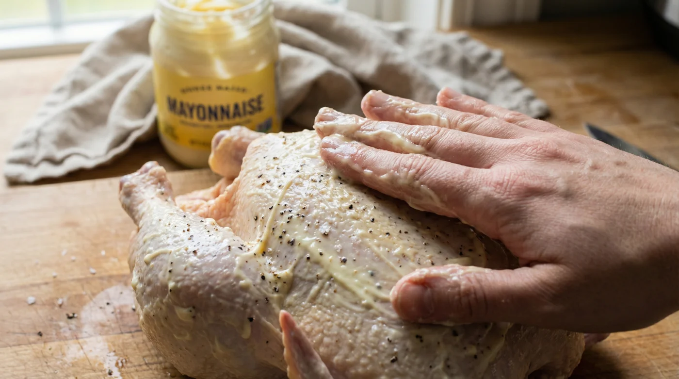 Enter a quiet staple sitting right in your refrigerator door: store-bought mayonnaise. The magic lies in the emulsion. Mayonnaise is an intricate, stable bond of egg yolks, oil, and a touch of acid. When you coat a raw chicken in this spread, it does not melt off the meat and pool in the pan. It forms a resilient, clinging armor. The oil aggressively browns the exterior, while the protein in the eggs acts as a binder, locking the meat’s natural moisture inside the bird.