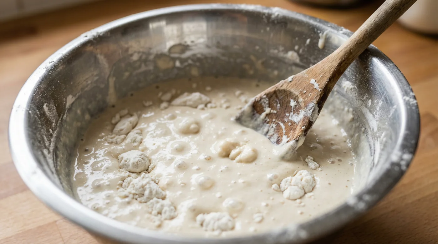 | Visible streaks of dry flour on the surface | Rapid, tiny bubbles popping during the mixing phase |