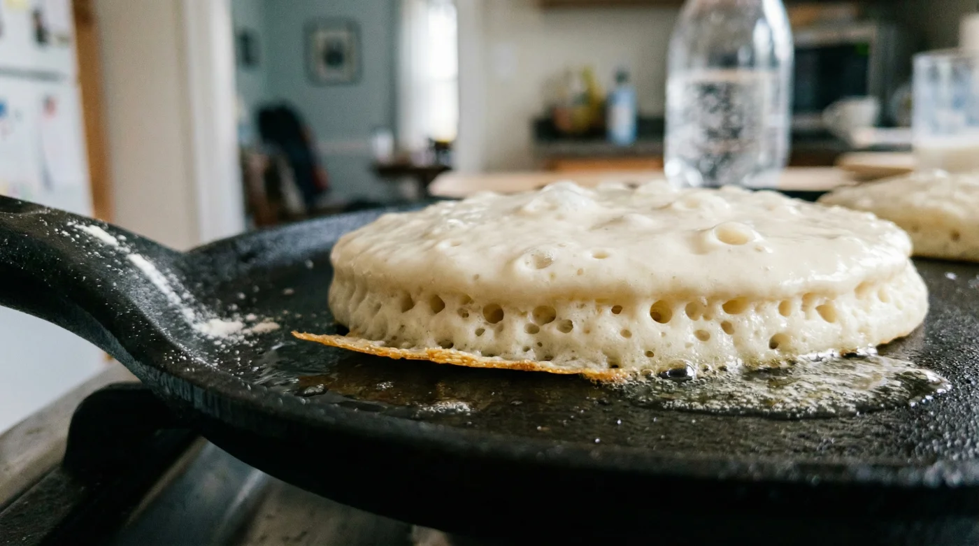 Drop the batter onto a hot, buttered surface. You will immediately notice the edges standing taller than usual. Wait for the surface bubbles to pop and stay open, then flip once. Never press the spatula down on the cooking cakes.